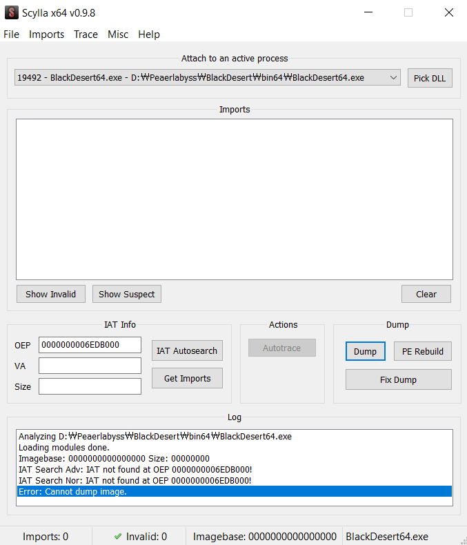作为一个cannot,我正在尝试跟踪这篇博客文章关于反向工程的黑色沙漠,但是看起来Scylla,一个默认的x64dbg插件,并不适用于我,因为它抛出了错误(“无法转储图像”),如下所示。