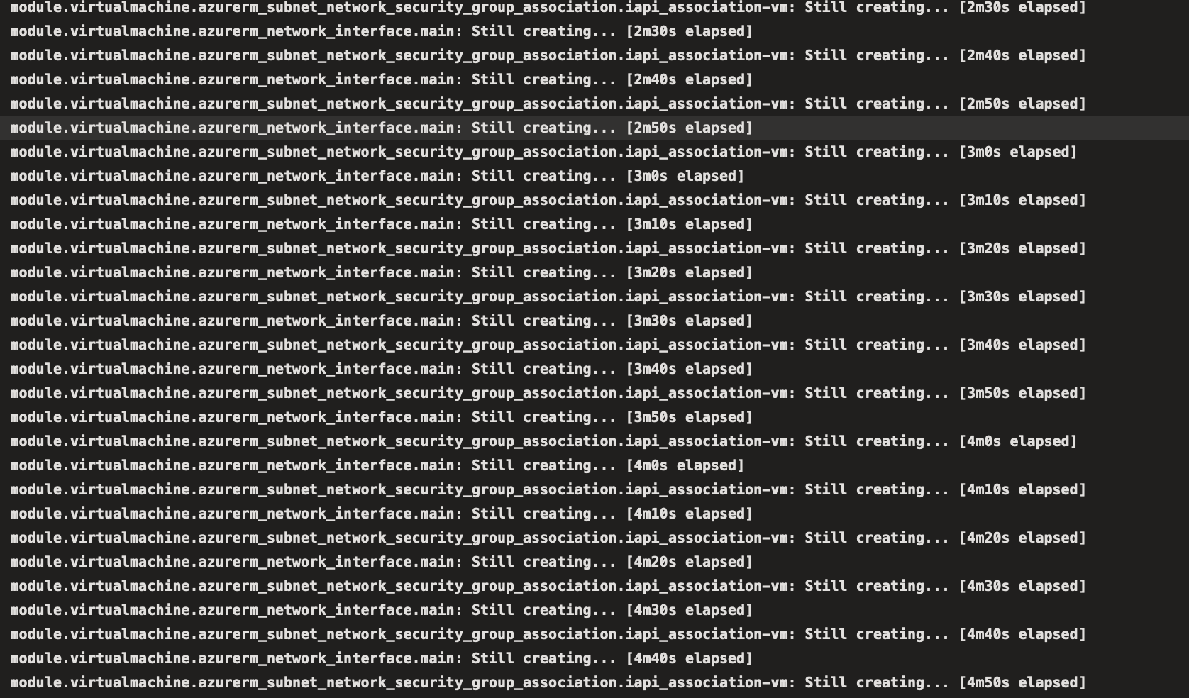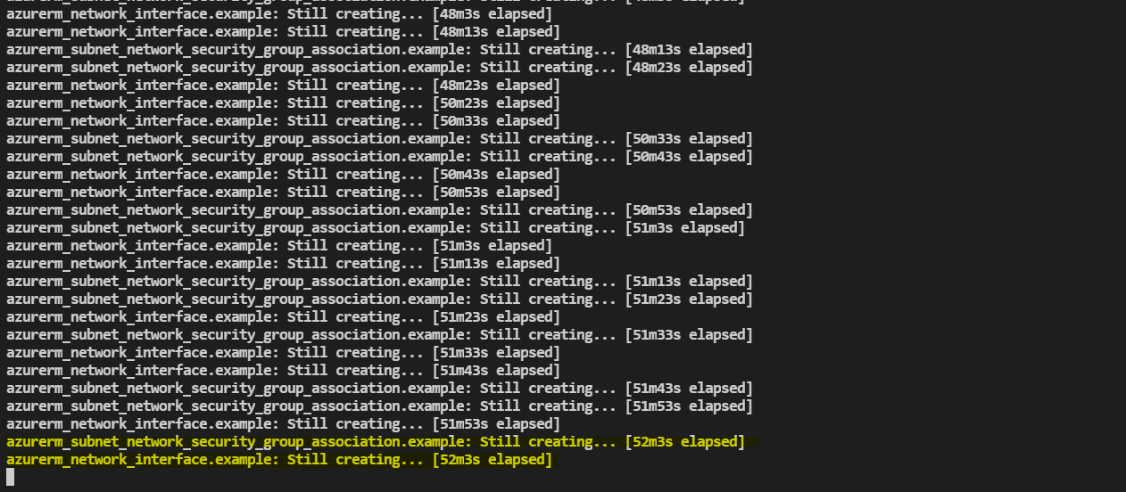 我正在尝试使用蓝色管道来部署海底(地形)。我使用的脚本部署了下面的代码,但是在很长一段时间内,潜艇的创建一直停留在创建状态,就像我使用本地部署一样,我可以在几分钟内轻松地部署它。
