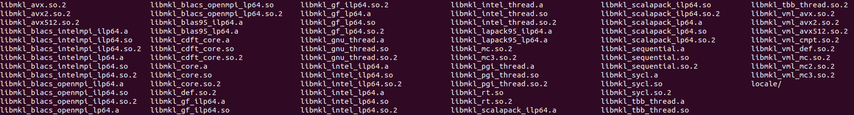 我需要准备一个构建环境,它允许用mkl库编译二进制文件: libmkl_core.so,.我最初使用了来自oneapi 网页的安装说明。mkl安装安装了以下库: