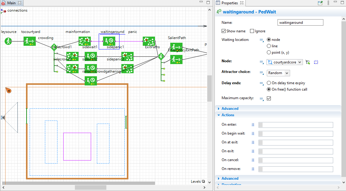 关于何时执行此操作的问题的答案是:这取决于模型的逻辑是什么。您基本上可以在任何块中键入此代码。如果您试图在发生紧急情况时模拟行人的行为,则需要在其中触发此操作(例如,它可能是一个event )。