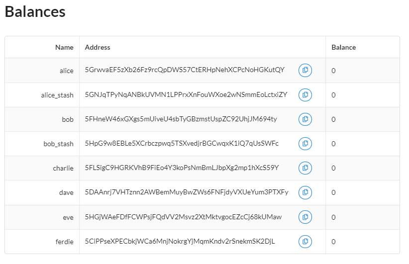 当我们推出基板-前端模板时,你首先看到的是一堆有余额的虚拟账户,我的印象是这些账户是从运行链的创世纪存储中提取的。但是,当我进入chain_spec.rs文件并删除所有帐户,甚至重命名testnet_genesis函数中的一些帐户时,我继续查看帐户,尽管帐户余额为零: