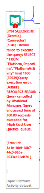 Error: Input Data (1): Error SQLExecute: [Dremio][Connector] (1040) Dremio failed to execute the query: SELECT * FROM "Platform_Reporting"."PlatformActivity" limit 1000