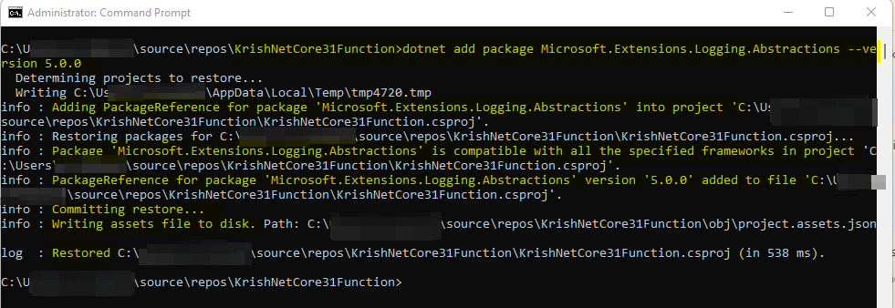 我试图重现这个问题,因为在安装包.Net Microsoft.Extensions.Logging.Abstractions版本5.0.0时,在安装包Microsoft.Extensions.Logging.Abstractions版本5.0.0时,没有出现以下步骤对5.0.0内核3.1和6版本的版本都有错误。