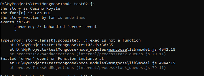 我在一个文件"test.js“中有下面的代码,在其中我试图填充story.fans[0].stories[0],但是它不起作用。其余代码运行良好,但当它试图填充扇子对象故事时,它似乎不起作用。猫鼬可以插2级子对象吗?