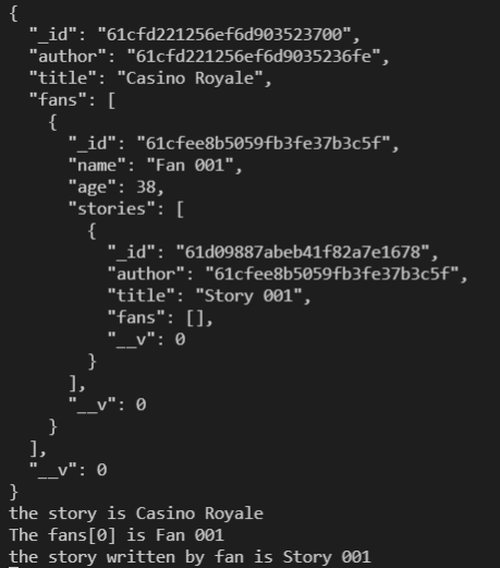 console.log('the story written by fan is', story.fans[0].stories[0].title);