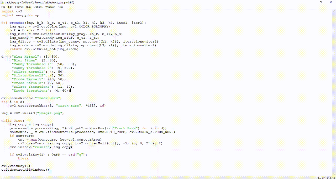 processed = process(img, *(cv2.getTrackbarPos(i, "Track Bars") for i in d))