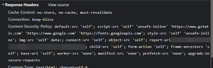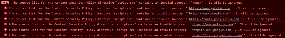 请参考https://developer.mozilla.org/en-US/docs/Web/HTTP/Headers/Content-Security-Policy/script-src#sources,其中的源应该和不应该有单引号。您必须从URL中删除单引号。在大多数情况下,您还可以省略https://,只留下源列表中的主机。