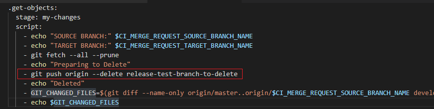 为了在使用管道时将任何更改推送到回购,您不能直接使用"git推源-删除“命令,必须使用类似的本地分支删除方式(git分支-d )并推送代码。