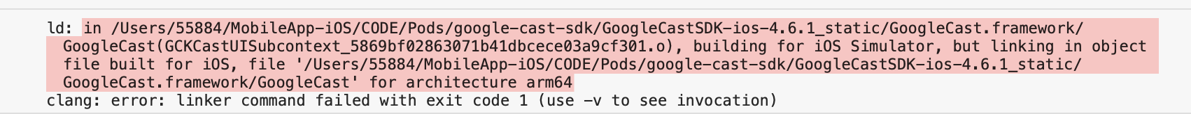 谷歌工程师目前正在开发这个已知的问题,2022年1月初,谷歌Cast SDK的4.7版将提供一个合适的XCFramework。虽然没有明确提到这一点,但我希望他们同时也能相应地更新吊舱。