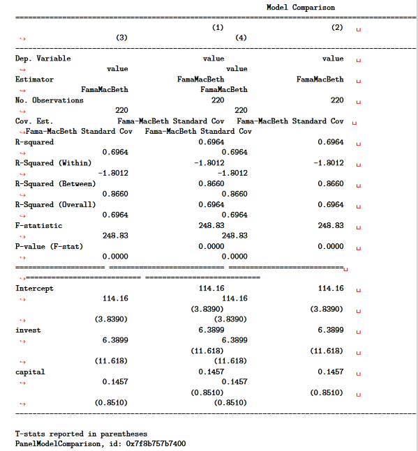 '(2)': FamaMacBeth.from_formula(formula='value ~ 1 + invest + capital', data=df).fit(),