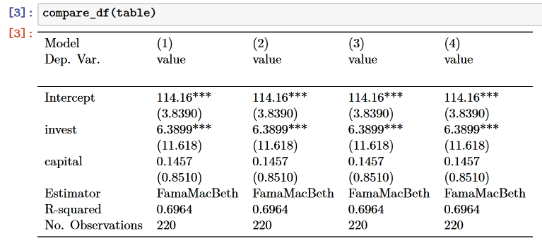 我使用Python来分析木星笔记本中的数据,我将这些数据转换为PDF与共同作者(jupyter nbconvert --to pdf)共享。我经常使用linearmodels.panel.results.compare()来比较来自linearmodels包的面板回归估计值。但是,PDF转换过程将compare()输出转换为对PDF太宽的固定宽度字体(我将提供下面的代码):