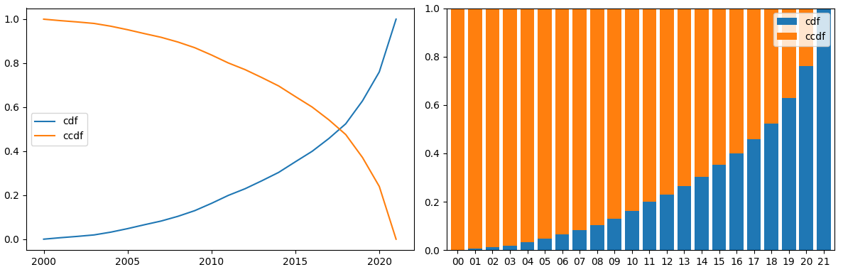 ax2.bar(years, ccdf, bottom=cdf, label='ccdf')