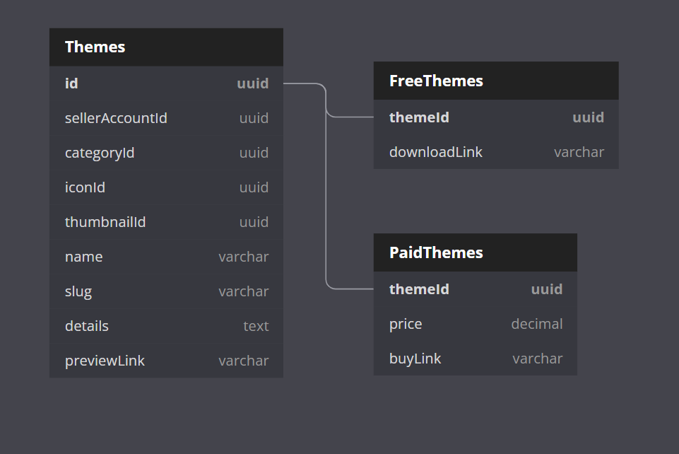 最后一种选择是向Themes表中添加一个“类型指示符”,并使用该标志,而不是在子类表中存在一行,以确定主题是免费的还是付费的。同样,也不是超级优雅,并且要求客户端应用程序遵守该标志,但它确实巧妙地表达了业务意图。