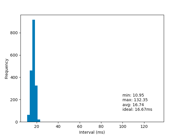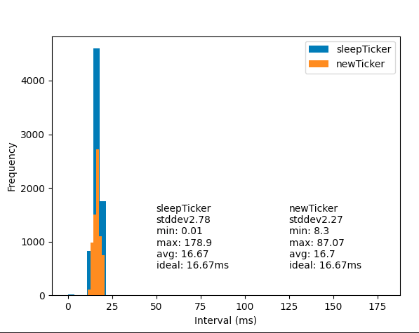 我正在编写代码来控制UDP上的外部LED,并且需要保持尽可能恒定的帧速率(例如60 to )。太多的抖动会看上去很糟糕。我用time.NewTicker编写了一个简单的测试,结果并不理想。我想知道是否有一种更精确的间隔来执行代码的不同方法。这个测试是在macOS上运行的,但是也需要在Windows和Linux上运行。至于它的价值,它需要同步到音频,所以可能有一个音频代码API在每个操作系统上,它有可能同步吗?