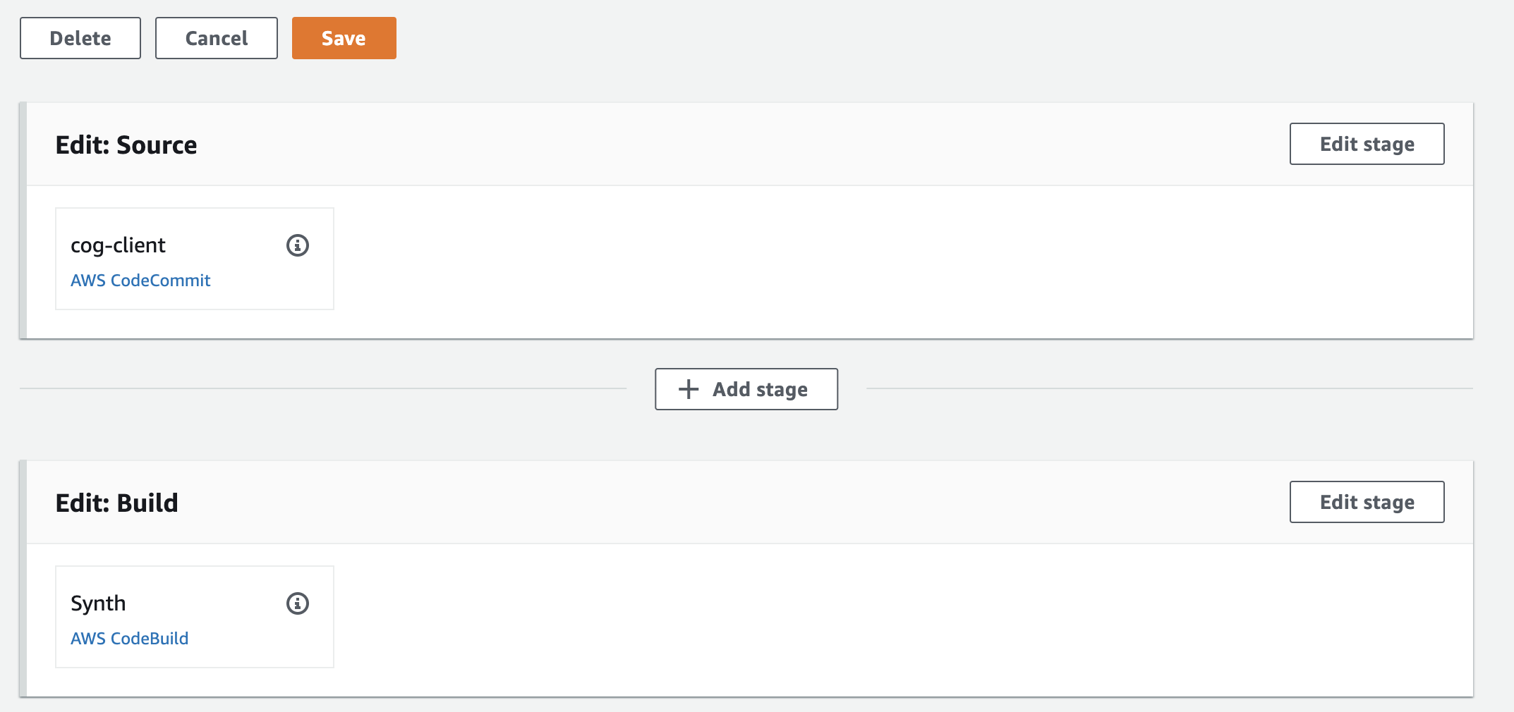 }运行cdk deploy之后,我可以使用控制台在Source和Build之前添加一个舞台,但我希望这是CDK代码的一部分。
