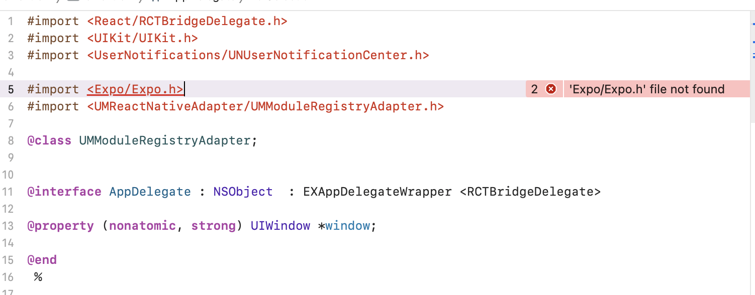 我正在尝试从react-native-unimodules迁移到expo模块。我遵循了这个文档,在Android中一切都很好,但是在iOS中,AppDelegate.h中提到了错误。