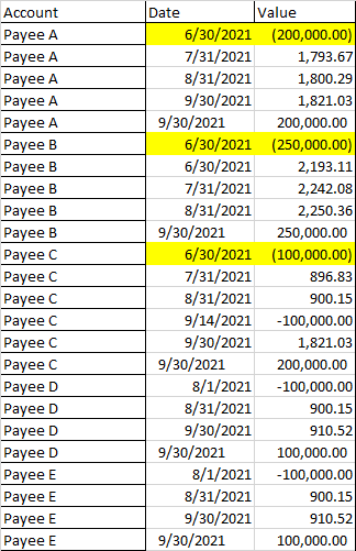 我有一份投资者名单,附上他们的付款和日期。我试图运行一个命令按钮,它将遍历每个帐户,查找它们的相关付款和日期,运行XIRR函数,然后将XIRR值放在每个帐户的右下方。这很简单,可以手工完成,但是当您有一个15000 cells+的电子表格时,它就会变得单调乏味,我正在尝试自动化这个过程。这变得困难,因为每个投资者有不同的支付金额,所以找到正确的位置放置XIRR的价值也使我感到困惑。