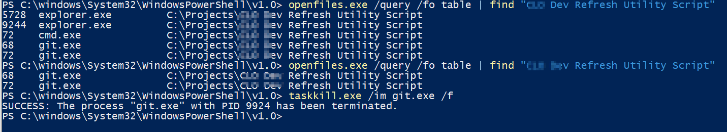 现在,我使用PowerShell跟踪锁定的文件并终止相关进程: