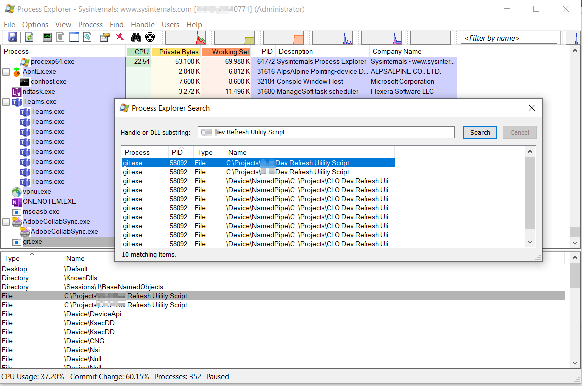 注意:我注意到了使用Windows文件句柄搜索实用工具的文件锁。为了找到锁,我必须使用Admin权限运行这个实用程序。请参见下面的快照。