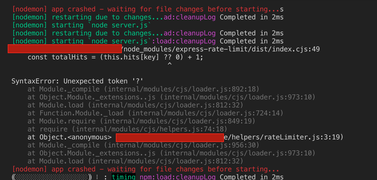 我正在尝试使用“快速速率限制”,并且由于某种原因,在运行服务器时,我得到了SyntaxError:意外令牌?尽管我很确定我的脚本没有任何语法错误。