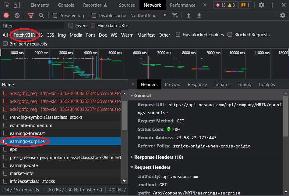 在检查从浏览器的"Network“选项卡发送的源和请求时,我们可以看到来自JS脚本的xhr请求被发送,并返回您要查找的数据。脚本发送请求的端点是:https://api.nasdaq.com/api/company/MRTN/earnings-surprise。
