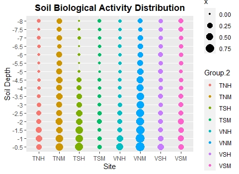 我想就不同地点的土壤深度绘制土壤有机体的活动图。我将我的数据从宽到长的格式进行了重组,并创建了一个新的数据框架,其中只有三个必需变量(组1=土壤深度,组2=站点名称,x=土壤有机体活动的平均值)。我绘制的数据如下: