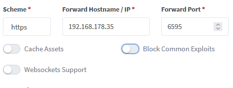 要在Nginx代理管理器中使用HTTPS,只需在SSL选项卡中选择证书即可。Details选项卡中的Scheme选项(您已经设置为https )必须是http,因为您转发到的主机(192.168.178.35:6595)没有SSL证书。证书只在代理上。