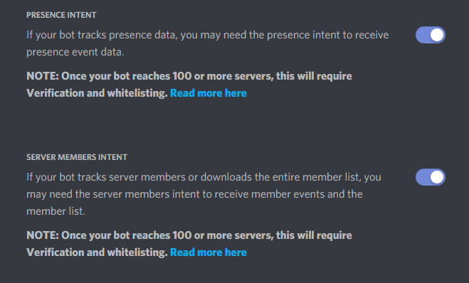是的,您的代码的问题在于特权意图。要解决此问题,您必须打开不和谐的开发人员门户中的Presence intent。