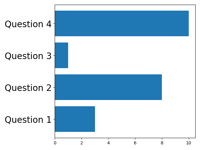 我想更改水平标杆y轴上的字体大小(即使“问题1”、“问题2”的字体尺寸更大)。我无法从barh的文件中找到解决方案。有可能这样做吗。如果是,哪里可以找到答案?
