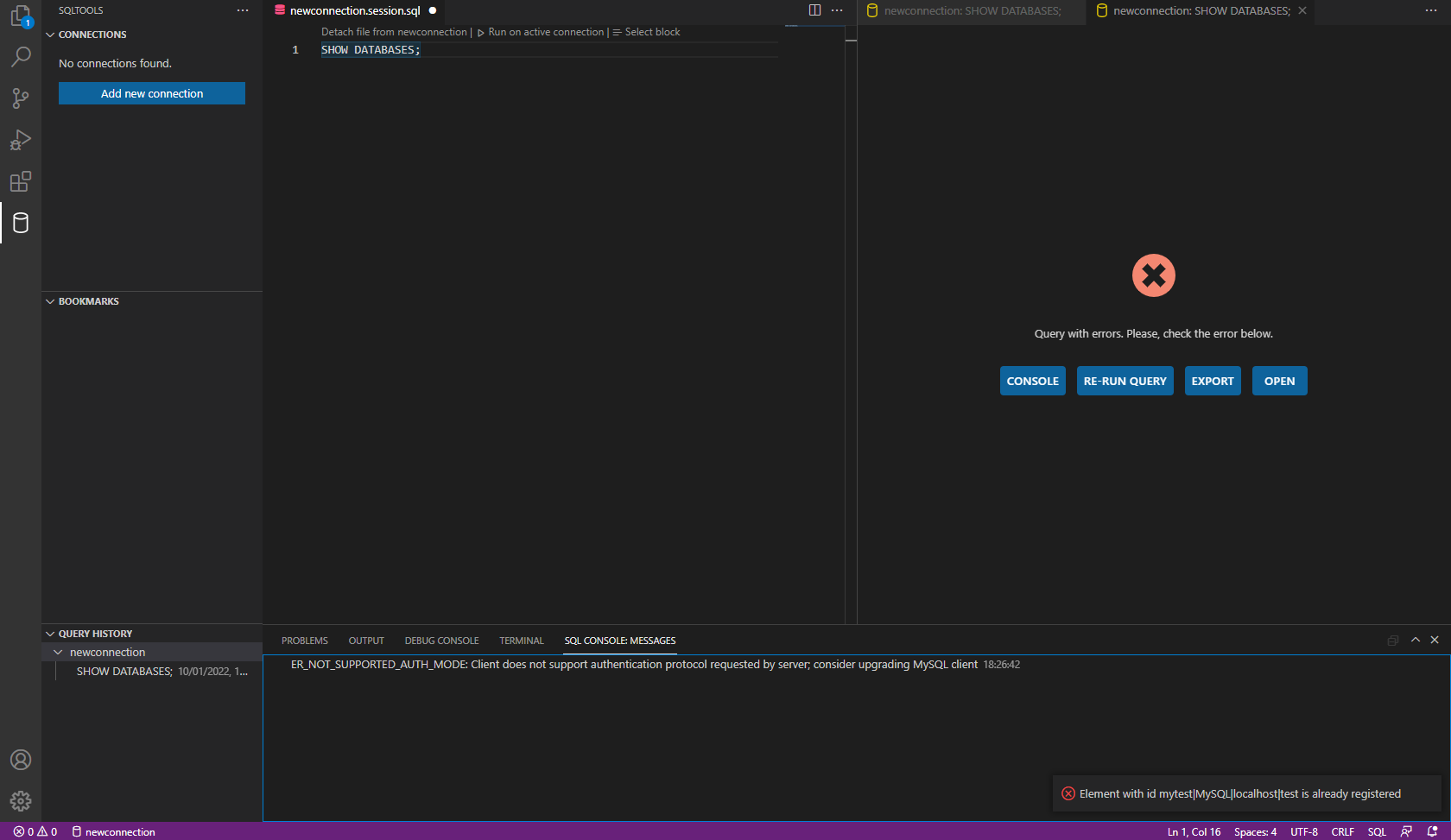 我不知道这是不是该问的地方,但我很绝望。因此,我试图在VSC上与SQLTools建立连接,但这是行不通的。我认为这是建立联系,但它只是没有出现。我不知道这是为什么,但我尝试重新安装扩展和MySQL本身。它还为我认为已删除的旧数据库或连接提供了一个错误。我不知道如何删除一个连接,我应该如何创建一个新的连接。请帮帮我。提前感谢
