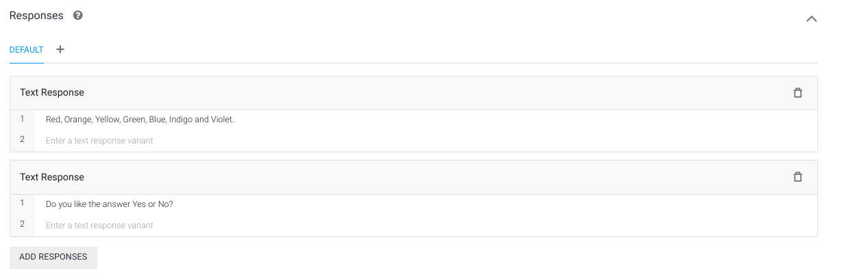 考虑到你已经有了一个第三方工具来做正面和负面反应的分析,你可以使用多个回应,而不是使用后续意图,这样用户就不会在他们达到满意程度之前输入任何东西。您只需将您的满意度评级:“您是否满意这个答案Y/N”作为您的第二个响应捕捉是/否或Y/N响应从用户。只需在“响应”部分下单击“ADD RESPONSES”