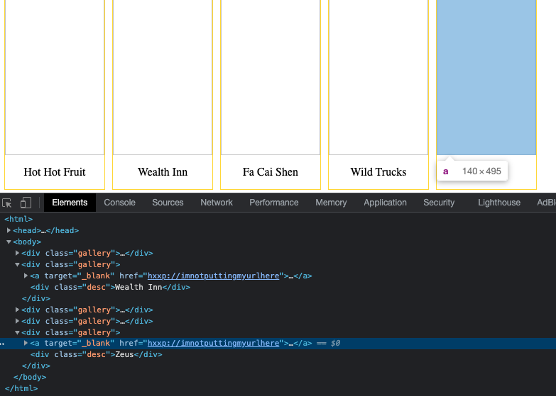 在a示例中,您必须放置display: block;,它将覆盖整个img标记。名为<div class="desc">Zeus</div>的Div不在a标记之外。