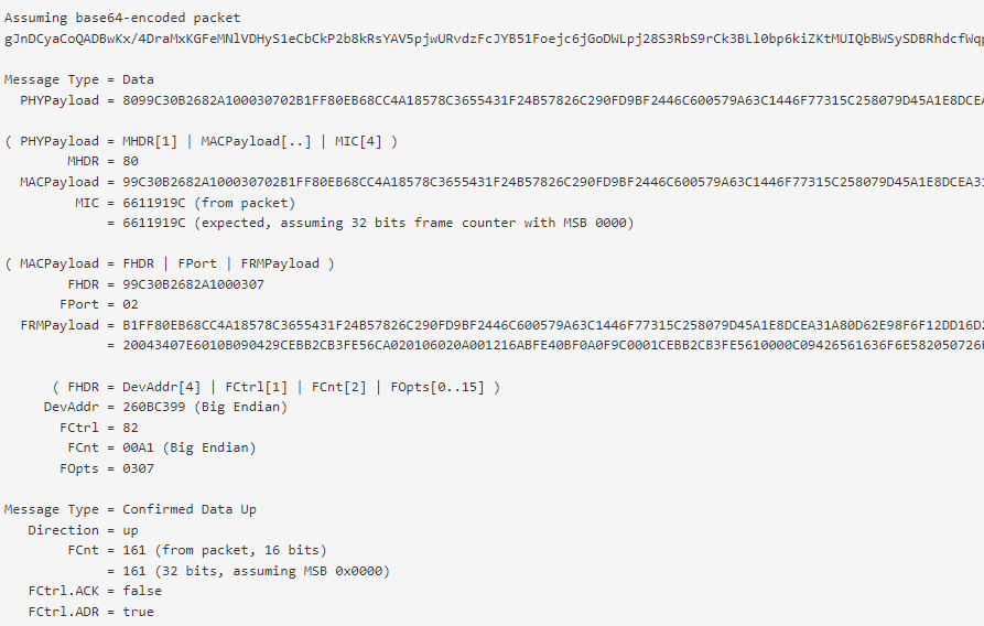 我有一个基于LoRaWAN网络的系统。它从Base64编码网关获取信息。我需要将它从NwkSKey和AppSKey解码成一个有效的HEX包。它不是关于Base64ToHex的简单功能,而是关于基于密钥的解码。有一个在线页面,它告诉我,我的数据是正确的,它可以通过这些键正确地解码。但是,我需要把它列入我的议程。我在git:https://github.com/sntcz/LoRa.Message中找到了一些脚本,它可以很好地解码,但不考虑密钥。在FRMPayload文件中,对密钥的解码似乎也在进行,但在程序启动时不调用解密函数。