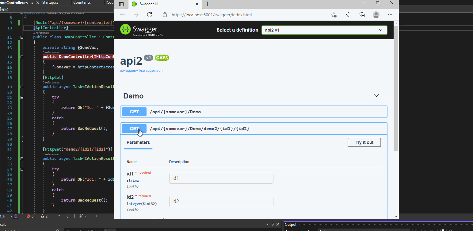 calling localhost/api/test/client[Route("api/{somevar}/[controller]")]