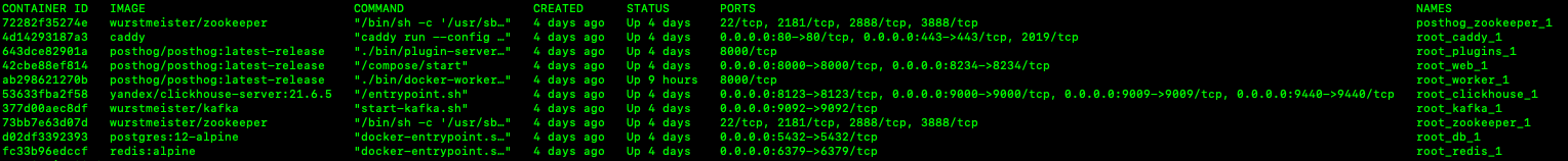 我在我的vps上安装了他们所谓的业余爱好安装脚本,一开始很好。但是就在我重新启动ubuntu并再次访问了我自己托管的posthog站点之后,它就不会加载并且只显示一个空白页。在我重新启动我的副程序后好像出了点问题。我已经使用命令docker检查了Posthog所需的所有服务,并且一切都已启动并运行(请查看附带的屏幕截图)。