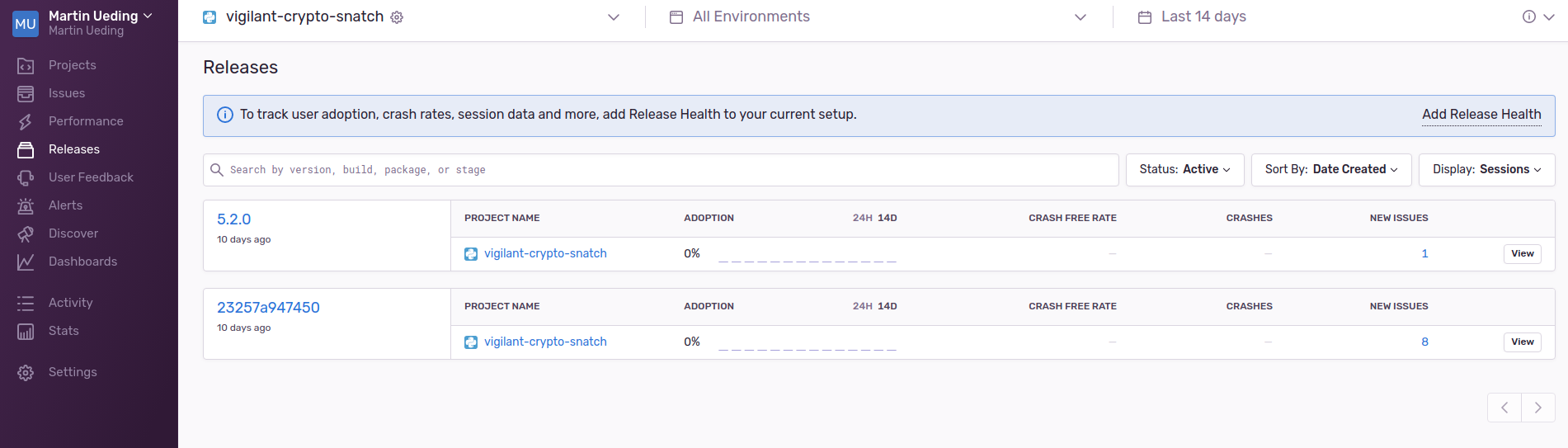 sentry_sdk.set_user(dict(id=get_user_id()))这也是为了跟踪用户会话,无论如何,auto_session_tracking将默认为True。然而,当我查看web界面时,我看到我的消息(通过sentry_sdk.capture_message(event)发送)出现了,但是没有跟踪发布版本的用户: