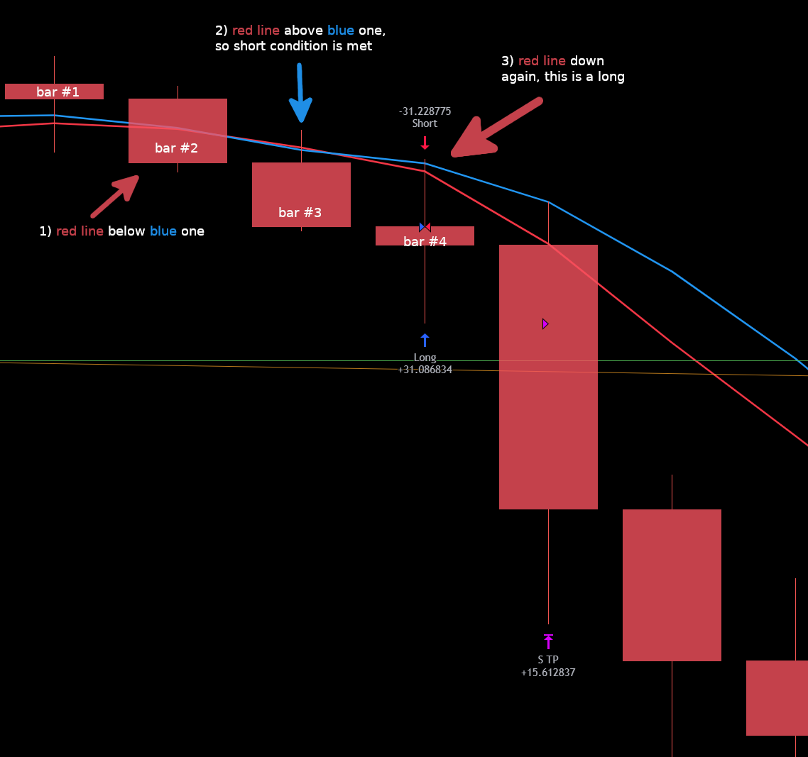 因此,在第3栏结束时,策略计算引擎执行计算,并确定进入空头头寸的条件得到满足,创建一个市场订单,在下一个勾号上执行,因为当前的条形图关闭了(这是进行计算的最后一个勾号),那么下一个勾号将打开第4栏。在第4栏打开时,执行该命令,该策略进入空头位置,因为您在订单填写后使用重新计算,策略被重新计算,而且由于有一个反向交点(从第3栏到第4栏),进入多头仓位的条件已经满足,因此策略在第一个滴答中就会立即做多。如果禁用了订单执行后的重新计算,则只有在第4栏结束时才会重新计算策略,而命令只能在下一个勾号(第5栏的开始)执行。