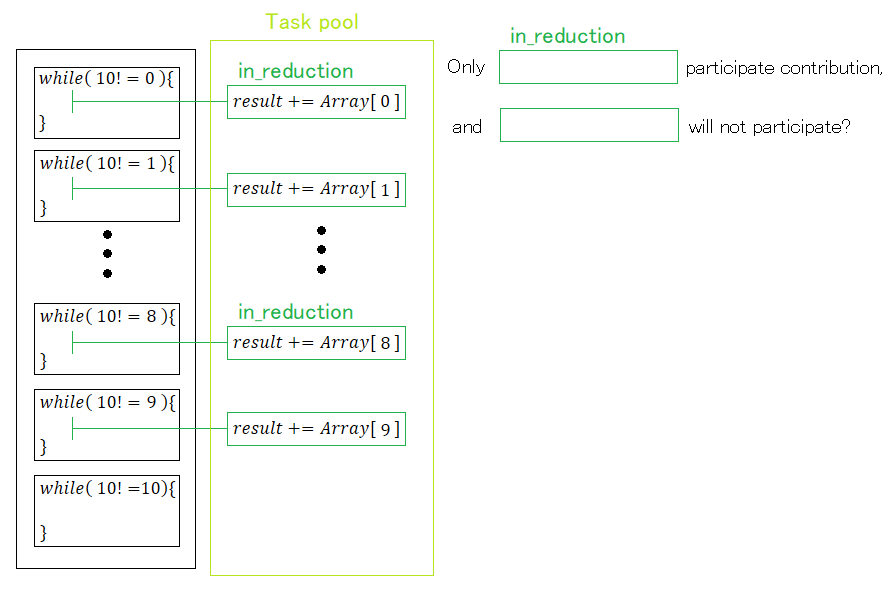“in_reduction”在做什么?在文本中说,“in_reduction子句指定任务参与缩减”,但这意味着什么呢?在“in_reduction”中,我们需要与减缩相同的子句。