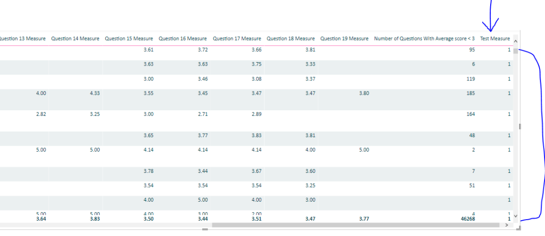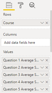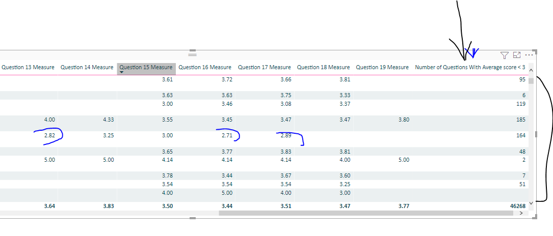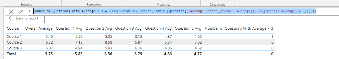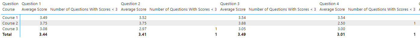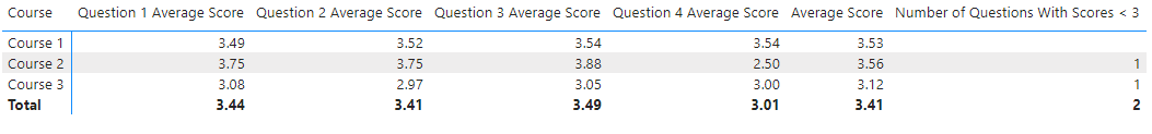 Number of Questions With Scores < 3 = CALCULATE(COUNT('Table'[Question]), FILTER('Table', [Average Score] < 3))但是,不能将其添加为矩阵末尾的单独列。如果将均分作为矩阵中的值,以问题作为列标题,以课程作为行,并且将此新度量添加到值中,则每个问题都将得到一个带有此新度量的列,并在结尾得到一个总计: