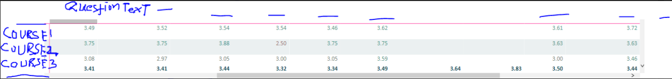 在问题2下面的屏幕截图中,课程3的平均值低于3.0,而对于课程2,问题4的值低于3.0,我想数数这些问题并显示在一栏中。有什么想法吗?