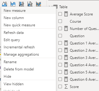 Question 1 Average Score = CALCULATE([Average Score], FILTER('Table', 'Table'[Question] = "Question 1"))您需要为每个问题添加此度量,方法是右键单击要向其添加度量值的表,并选择“新度量”: