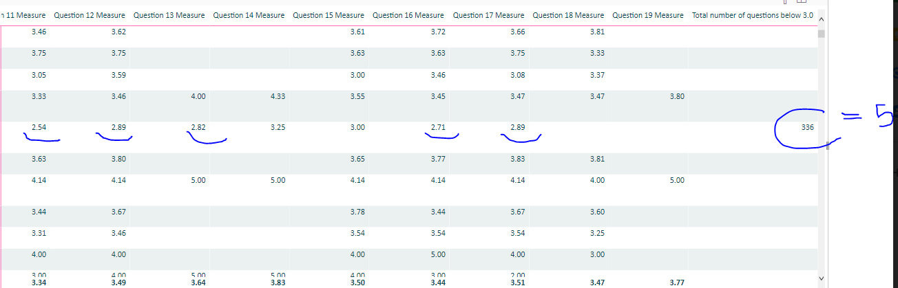 这是表格的例子。十进制值是平均数。左边是一列中的课程标题。矩阵的另一端是作为字符串的问题。这些值是平均值,我试图检查哪个问题的值低于3.0,并计算出平均值低于3.0并显示在一列中的问题数。