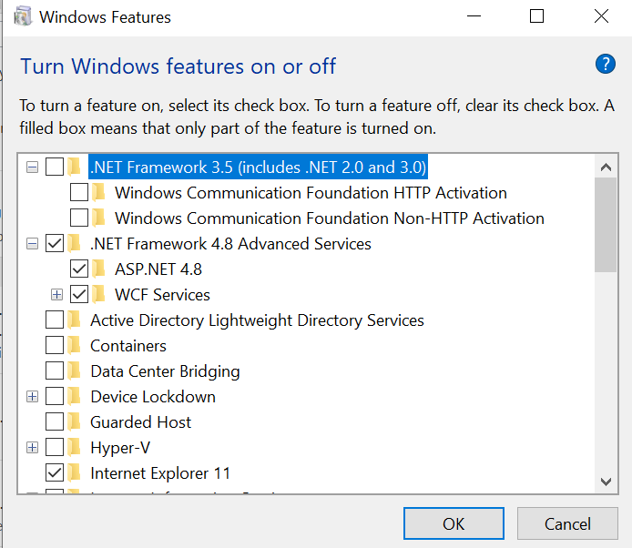 at SAPConnector.API.Middleware.ApiExceptionHandlingMiddleware.Invoke(HttpContext context) in C:\Users\nbaki.DOMARI\Projects\SAPConnector\SAPConnector.API\Middleware\ApiExceptionHandlingMiddleware.cs:line 32我跟随了这么多关于解决类似问题的文章和指南,但一直未能解决。我已经启用/禁用了所有Windows功能。我已经从IIS中删除了ServiceModel。我甚至完全禁用了.NET 3.5,感觉好像有冲突。我尝试过通过.NET v4注册aspnet_regiis.exe -iru,但它告诉我通过"Windows“或”done“来管理它,我已经这样做了。