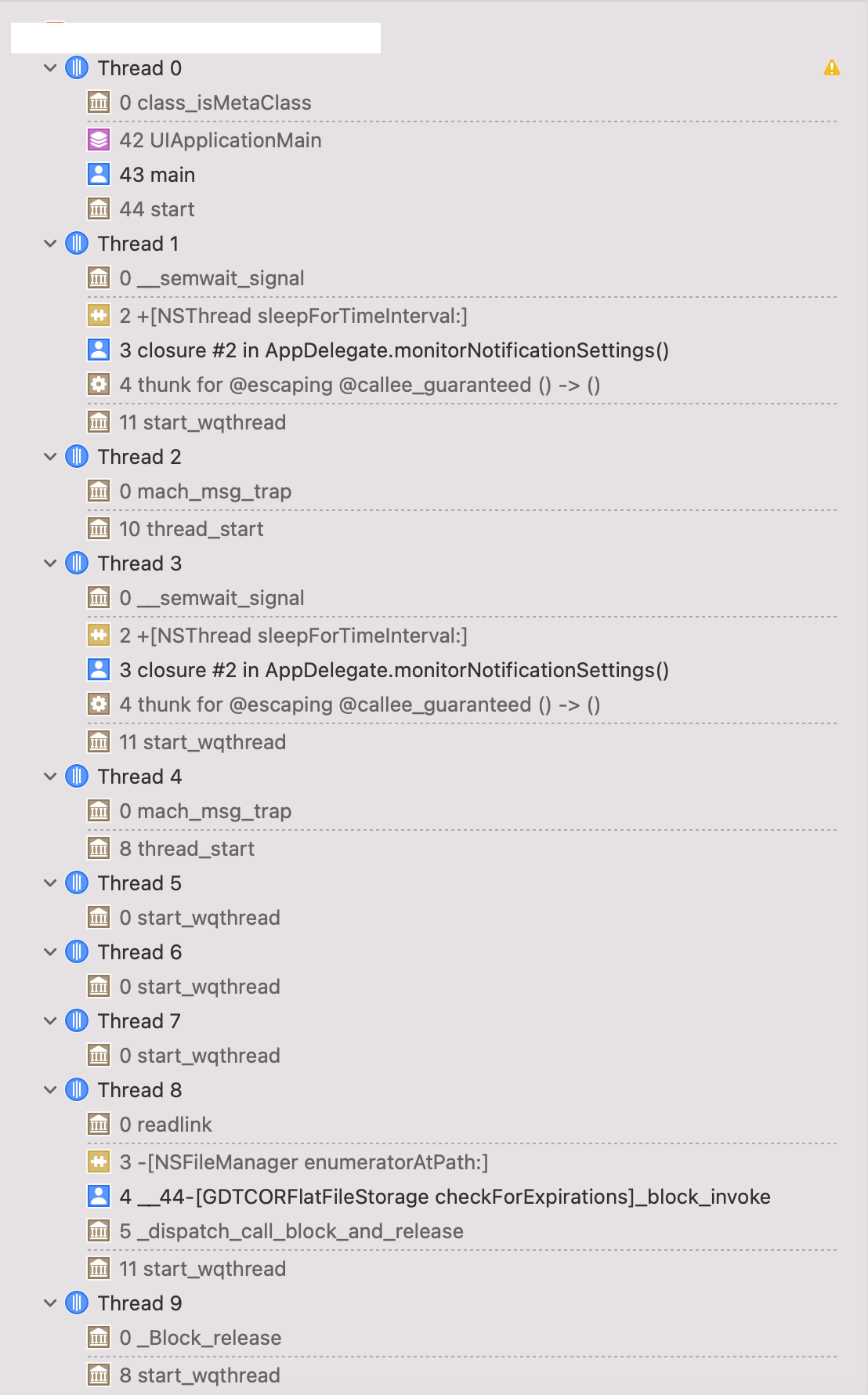 2 Foundation 0x00000001824c49e0 +[NSThread sleepForTimeInterval:] + 152 (NSThread.m:504)