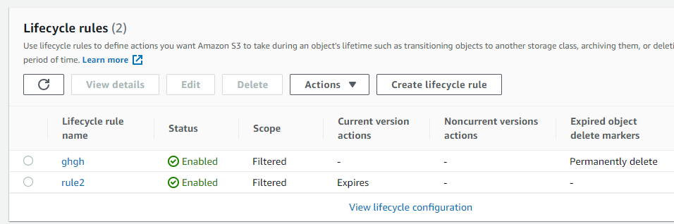 每个桶都有一个生命周期配置,可以有多达1000个规则。您的控制台可能会显示类似的内容: