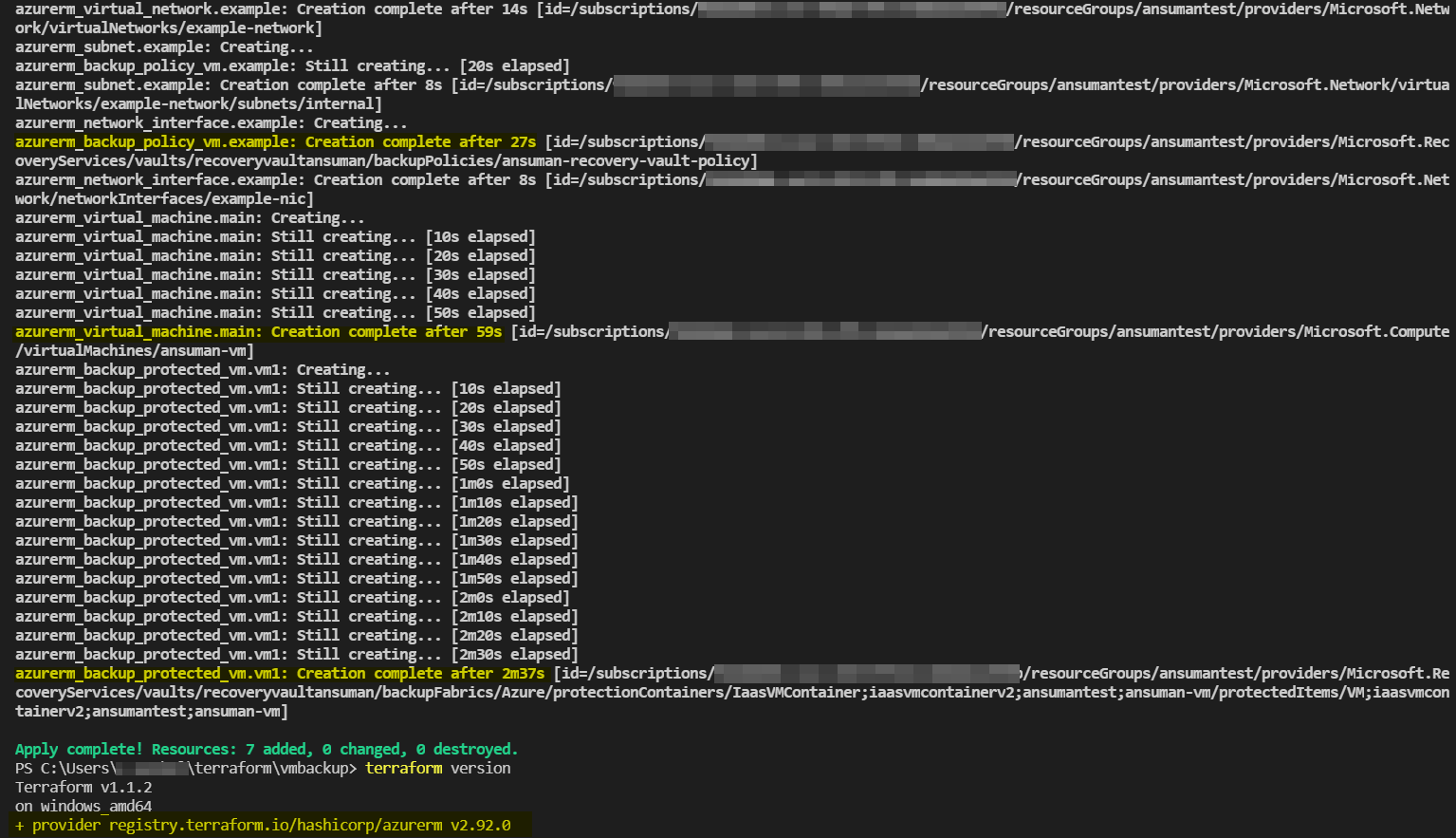 我试图创建一个备份策略并启用备份,同时使用terraform (TerraformVersion1.1.13,Azure Provider - 2.90.0)提供Azure VM。Terraform无法启用以下错误的备份。