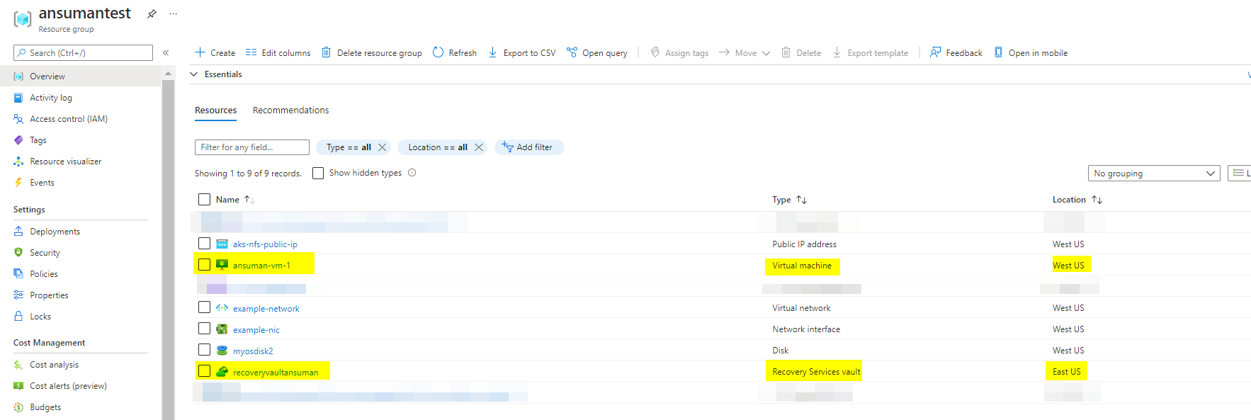 要解决这个问题,您必须对所有资源使用与恢复服务库相同的位置,例如,在我的示例中,与资源组(East US)相同