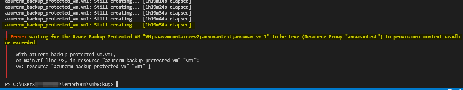 Error: waiting for the Azure Backup Protected VM "VM;iaasvmcontainerv2;Test-product-cloud-infra;arulazurebkup-vm" to be true (Resource Group "Test-Product-Cloud-Infra") to provision: context deadline exceeded