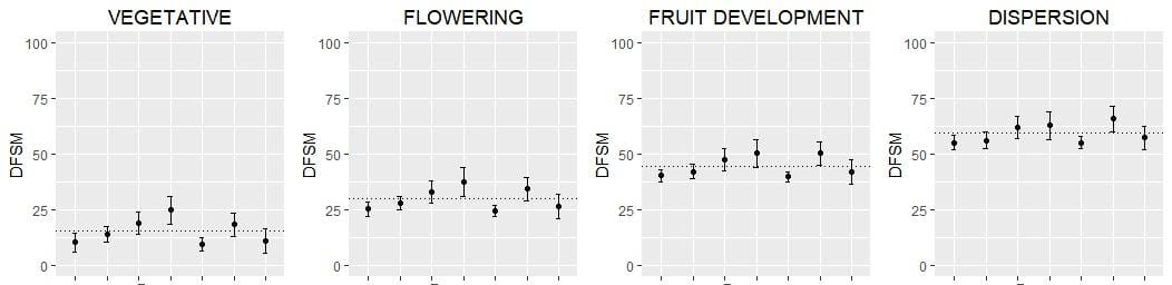 模型建立和修正后,我们要预测每种植物从融雪开始的天数,以达到感兴趣的物候阶段,它们的平均值分别为2、3、4和5。(分别对应于营养期、开花期、果实发育期和离散期),我尝试了函数predict(),但每个物种之间没有异质性,进展似乎是线性的(如图像文件所示)。