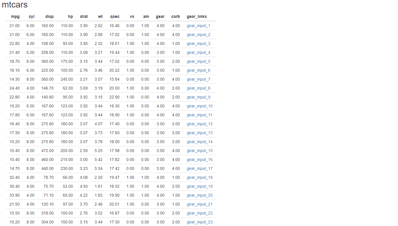 mutate(gear = actionLink("gearinput", label = gear)) #I realize this does not work, just leaving here as pseudo code.